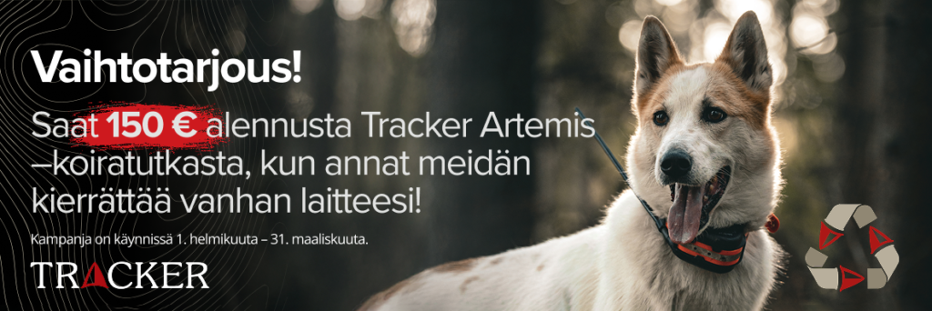 Voit vaihtaa yhden (1) kappaleen mitä tahansa koiratutkaa uuteen Tracker Artemis -koiratutkaan kampanja-aikana 1.2.–31.3.2026 hintaan 549 €!